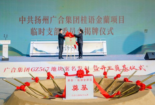 活動現場,揚州廣合集團桂語金蘭項目臨時支部委員會正式成立。廣合集團黨委副書記楊長海宣讀了《關于同意成立中共揚州廣合集團桂語金蘭項目臨時支部委員會的批復》,集團黨委書記、董事長陳斌、區委組織部副部長顧冬共同為項目臨時支部揭牌。在項目案名發布伊始,廣合集團即將黨支部建到項目工地上,這既是項目開工的奠基,更是紅色戰斗堡壘的奠基。以黨建引領業務發展,把黨的領導貫穿項目建設始終,為集團高質量發展提供了強大的組織保證。